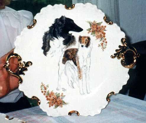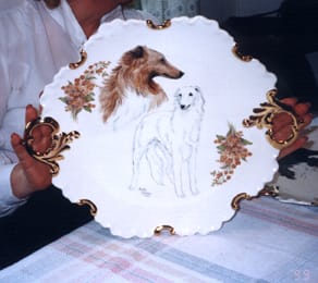 The original for the drawings on the plates was a photo taken by Francie Stull at a sighthound show in Donaueshingen in Germany in 1998, when the first Silkens arrived to Europe. At the time, it was a very unique photo, depicting 3 rare breeds in the same photo.